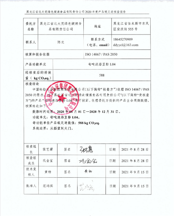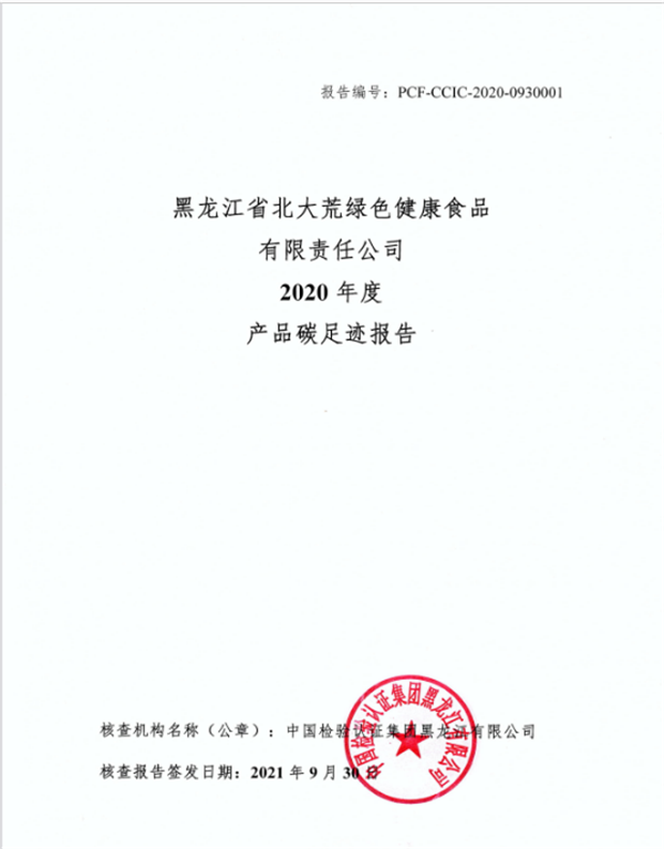 黑龍江省北大荒綠色健康食品有限責任公司2020年產品碳足跡報告